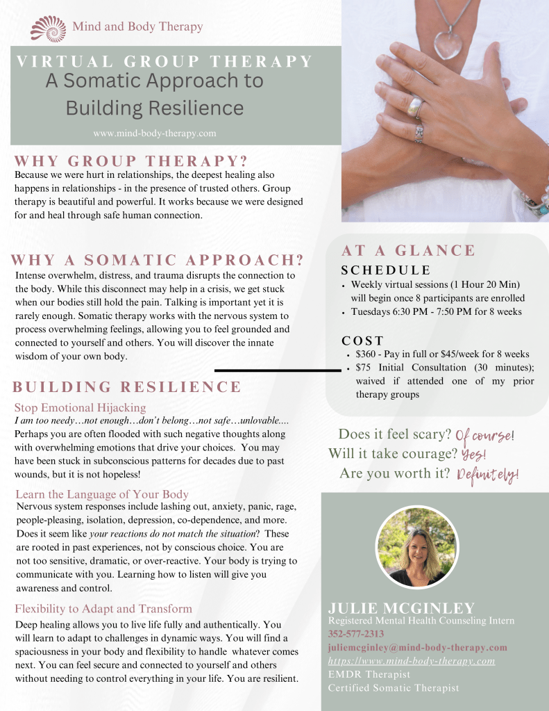 Each group will begin once a sufficient number of participants are registered. Pre-screening is required. Please email juliemcginley@mind-body-therapy.com.